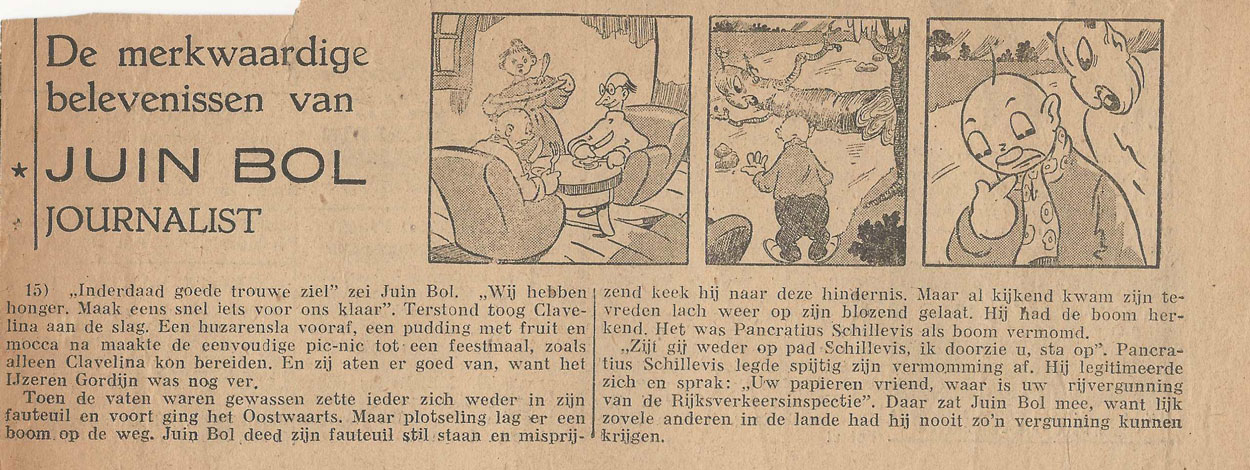 In een nader te identificeren krant uit de omgeving Den Bosch verscheen eind 1947 'De merkwaardige belevenissen van Juin Bol, journalist'. Samen met professor Jurriaan Boterbloem en zijn "dienstmaagd" Clavelina onderzoekt hij de geheimen van het IJzeren Gordijn. Hierin worden zij bovenal gehinderd door Pancratius Schillevis, een "speurder in duistere aangelegenheden", wiens vermommingen echter nooit het gewenste effect hebben. Na een aantal wonderlijke omzwervingen komen kwamen Juin Bols avonturen na 64 afleveringen ten einde. De maker van deze strip is ons onbekend. Qua tekenstijl doet de strip wat aan Bob Uschi denken, al lijken enkele vroege afleveringen de signatuur "TIM" of "JIM" te dragen. Gezien de positieve benadering van staken aan het eind van het verhaal, zou de krant uit de socialistische hoek kunnen komen.