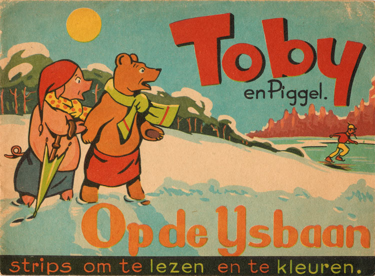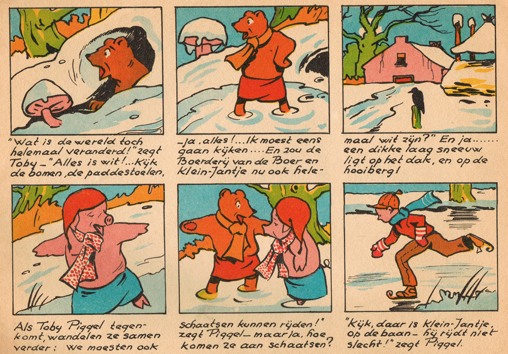 Uit 'Toby en Piggel op de IJsbaan'. Dezelfde pagina werd op de naastgelegen bladzijde ook afgedrukt, maar dan in zwart-wit.