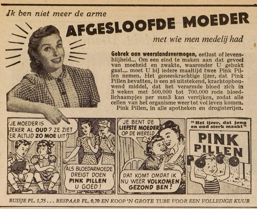 'Ziet je moeder er oud uit? Dan bieden Pink Pillen uitkomst!' (Het Vrije Volk, 16 april 1952).