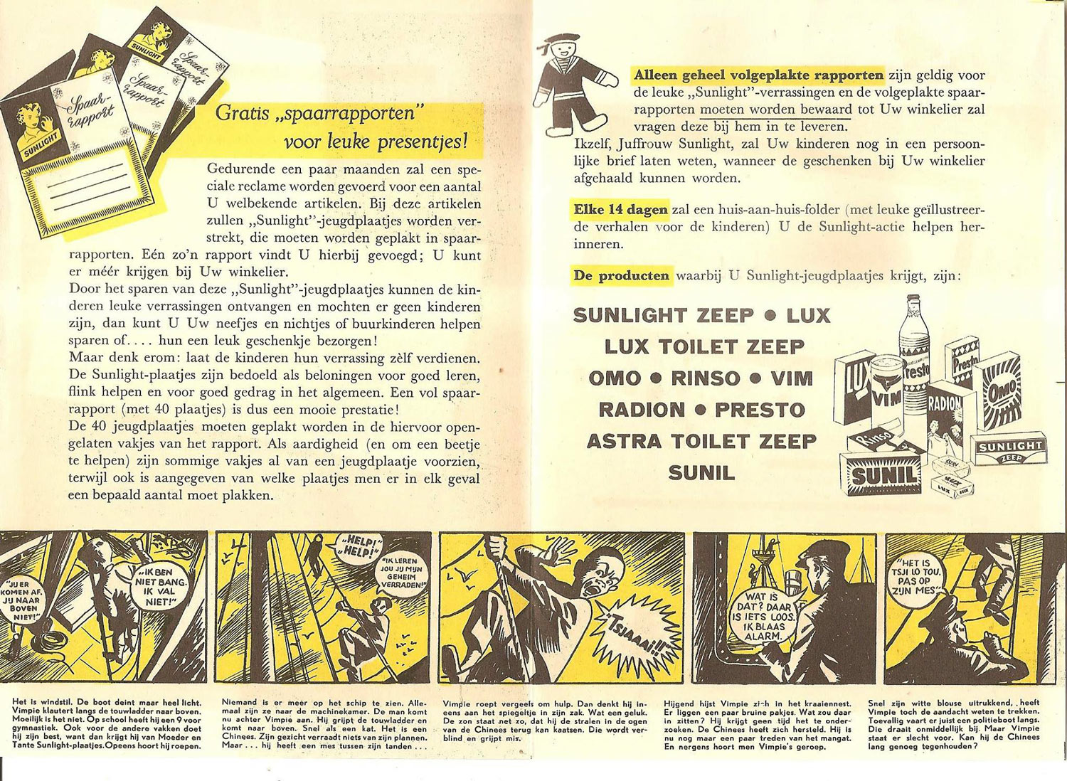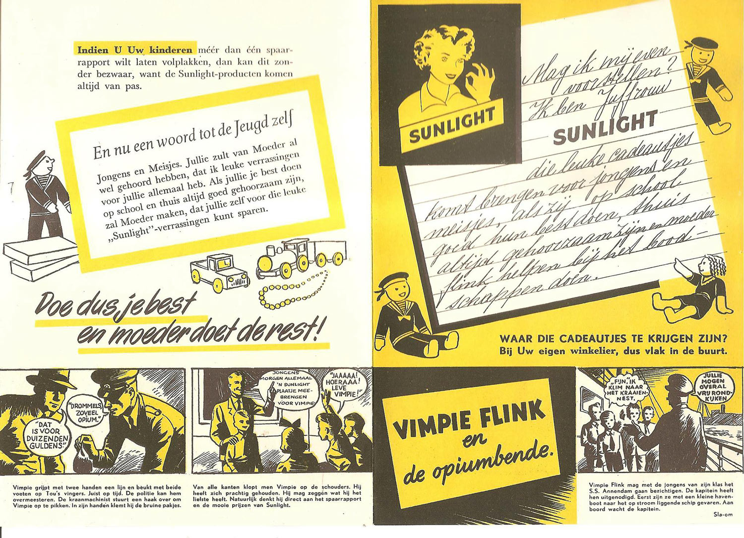 Ook het zeepmerk Sunlight startte een spaaractie voor kinderen. De plaatjes werden verkregen bij aanschaf van verschillende producten, naast Sunlight ook Lux, Omo, Rinso, Vim en Sunil. Ouders werden aangespoord de kinderen vooral de plaatjes te laten verdienen, "als beloning voor goed leren, flink helpen en voor goed gedrag in het algemeen". Het bijbehorende stripverhaal 'Vimpie Flink en de opiumbende' is voor ons vooralsnog van een onbekende maker...