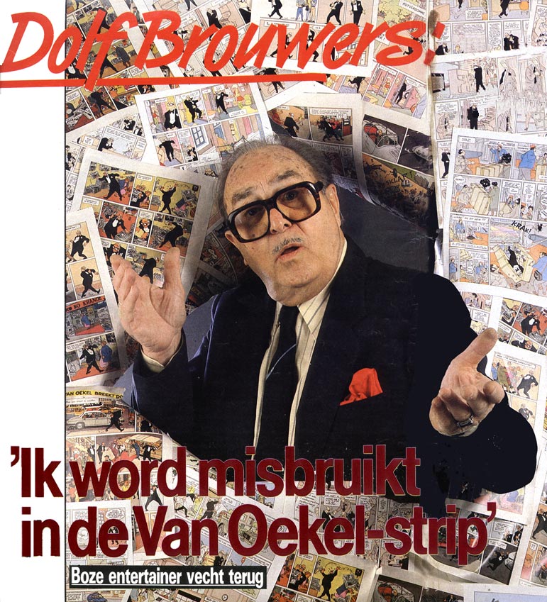 "Toen het tweetal acht jaar geleden met die strip begon, was ik aanvankelijk in mijn nopjes. Het idee dat er naar aanleiding van mijn succes een strip werd gemaakt streelde. Hoewel ik er geen cent wijzer van werd, beschouwde ik het als een erkenning voor mijn werk. Maar toen werden die stripboeken steeds schunniger. De Sjef van Oekel in die boeken begon meer en meer te vloeken. Ook de schuttingtaal die hij uitkraamde, begon me te irriteren. Alsof het allemaal niet genoeg was, begon hij ook achter de meisjes aan te zitten. Het gevolg is dat veel mensen nu denken dat ik, Dolf Brouwers, al die dingen óók doe in het dagelijks leven!"