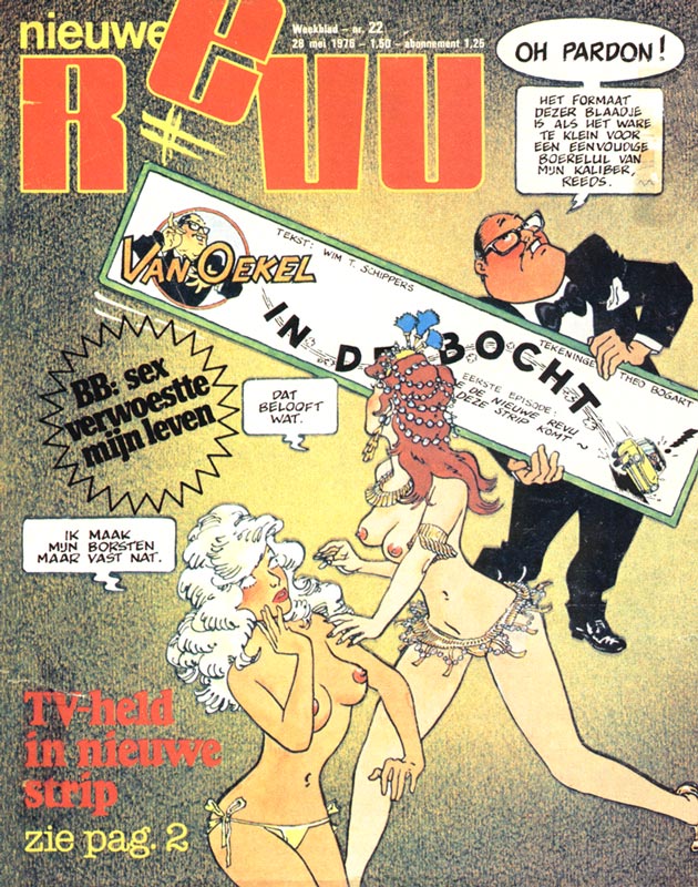 Links: Van Oekel's eerste optreden in Nieuwe Revu, 1976.