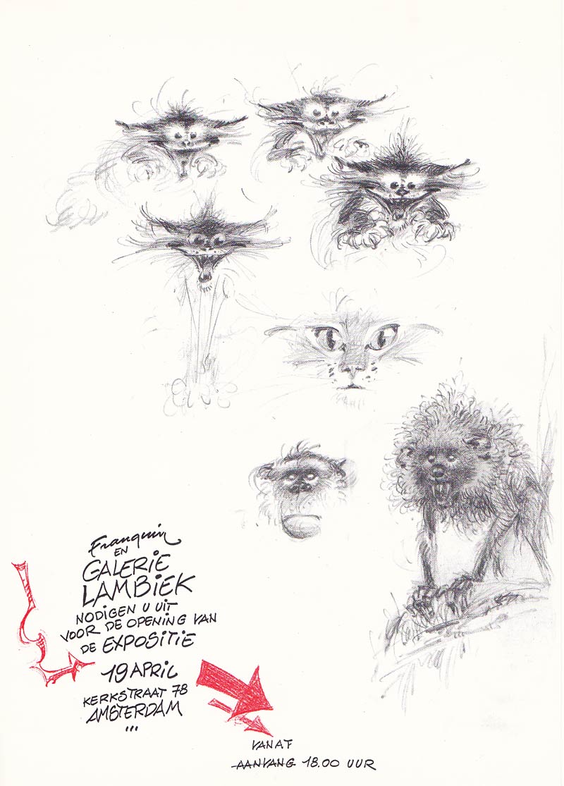 Tussen 1 maart en 15 april 1991 werden de intelligente gags van cartoonist Bob van den Born aan het publiek getoond. Lambiek had tijdens de jaren 1970 'Professor Pi' al uit de vergetelheid ontrukt door drie verzamelbundels van de reeks te publiceren. Afgaand op het aantal bezoekers die naar Van den Borns expo kwamen kijken waren zijn fans hem duidelijk niet vergeten. Niemand minder dat de Belgische grootmeester André Franquin, die onze winkel via exclusieve illustraties al diverse diensten had bewezen, belde Kees persoonlijk op of ook hij mocht langskomen voor een eigen tentoonstelling. Hij had een decennium eerder al een signeersessie gehouden, maar nu zocht de schepper van de Marsupilami een locatie om tekeningen te exposeren en verkopen om geld voor Unicef in te zamelen. Zoals veel mensen die Franquin persoonlijk kenden zullen bevestigen: de maestro was altijd aan het schetsen, zelfs in restaurants of aan de telefoon. Voor hem hadden deze abstracte droedeltjes weinig waarde, maar Kees verzamelde ze allemaal en liet ze fotografisch opblazen op grotere formaten. De tentoonstelling met deze meer persoonlijke en abstracte tekeningen liep van 19 april tot 19 juni en trok een grote massa aan, waaronder vele beroemde Nederlandse striptekenaars die deze legende allemaal eens wilden ontmoeten. Vele van hen hadden geschenken meegebracht. Uiteindelijk werd 20.000 gulden (9.000 euro, zonder inflatie) opgebracht om aan de arme kinderen van Oeganda te doneren. Op 18 mei 1991 signeerde Ted Benoit ('Ray Banana') zijn nieuwste album in onze winkel. Joost Swarte verscheen op 14 december voor nog een andere signeersessie.