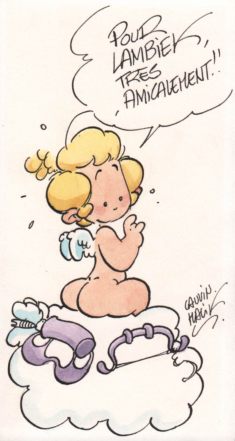 Felicitaties door Malik and Paul Deliège, getekend in Blois in 1994. De 'Jaap' tekening van Deliège werd gebruikt voor een Lambiek-advertentie in het vierde nummer van het stripblad Razzafrazz.