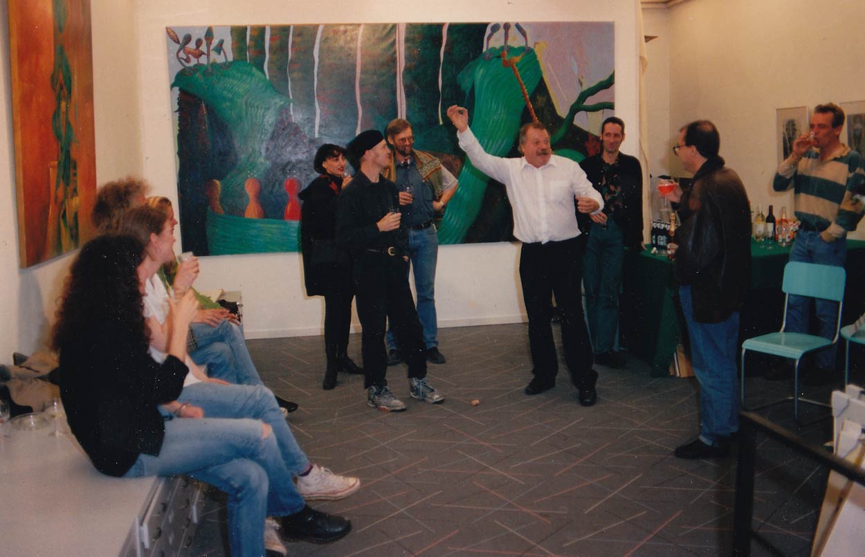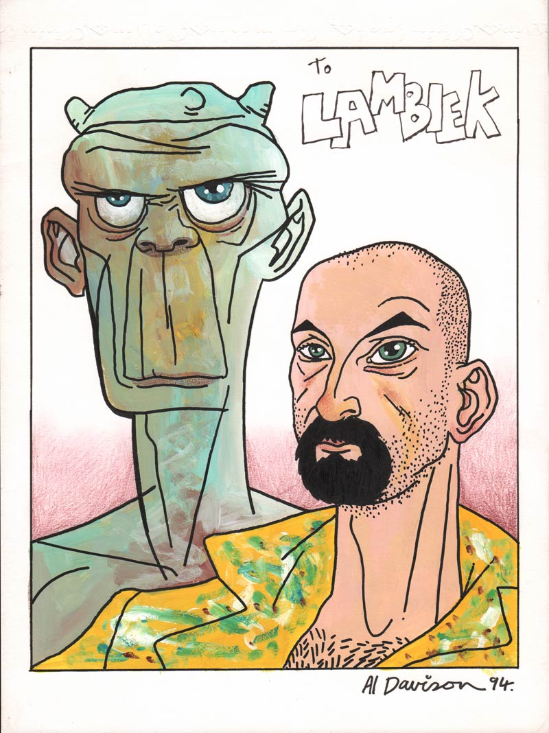 Ever Meulen stond centraal tijdens de volgende tentoonstelling, die van 11 februari tot maart 1994 werd gehouden. De schepper van 'Balthazar de Groene Steenvreter' en vele beroemde magazine- en albumcovers had altijd al de grens tussen strips en kunst bewandeld, dus lag het voor de hand dat zijn werk uitstekend geschikt was voor onze galerie. RAW-tekenaar Mark Beyer ('Tony Target', 'Death and Amy', 'Jordan at Beach Lake') stelde op 1 april in Lambiek tentoon en dat was geen grap! Zijn expo kon tot 31 mei bekeken worden. Onze verkoper Klaas Knol herinnerde zich dat hij met de doorgaans nogal ingetogen Beyer veel lol had tijdens het kijken naar 'Wallace and Gromit'-tekenfilms op tv. Helaas ontdekte de artiest bij zijn terugkeer naar zijn woonplaats in Allentown, Pennsylvania, dat hij slachtoffer van inbraak was geworden. In Lambiek sstonden hierna stonden Italiaanse artiesten in de schijnwerpers. Op 23 april 1994 signeerde Bruno Gazzotti zijn signatuurwerk 'Soda' in onze winkel, terwijl tussen 7 juni en 24 juli Matteo Guarnicca toeschouwers in onze galerie betoverde.