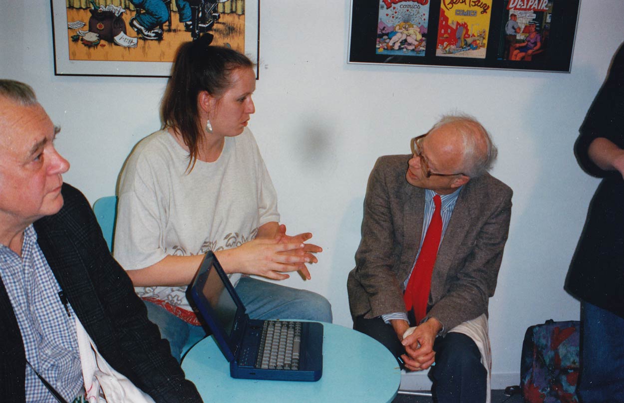 xxLINK's Wendy G.A. van Dijk toont onze gloednieuwe website aan Stripschap-oprichter P. Hans Frankfurther tijdens de Crumb expo (november 1994).