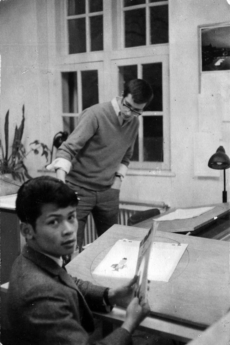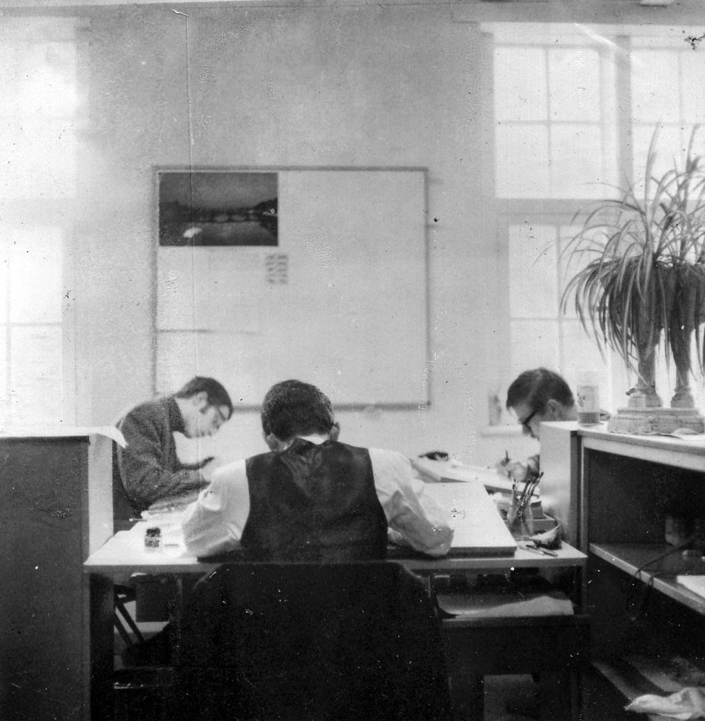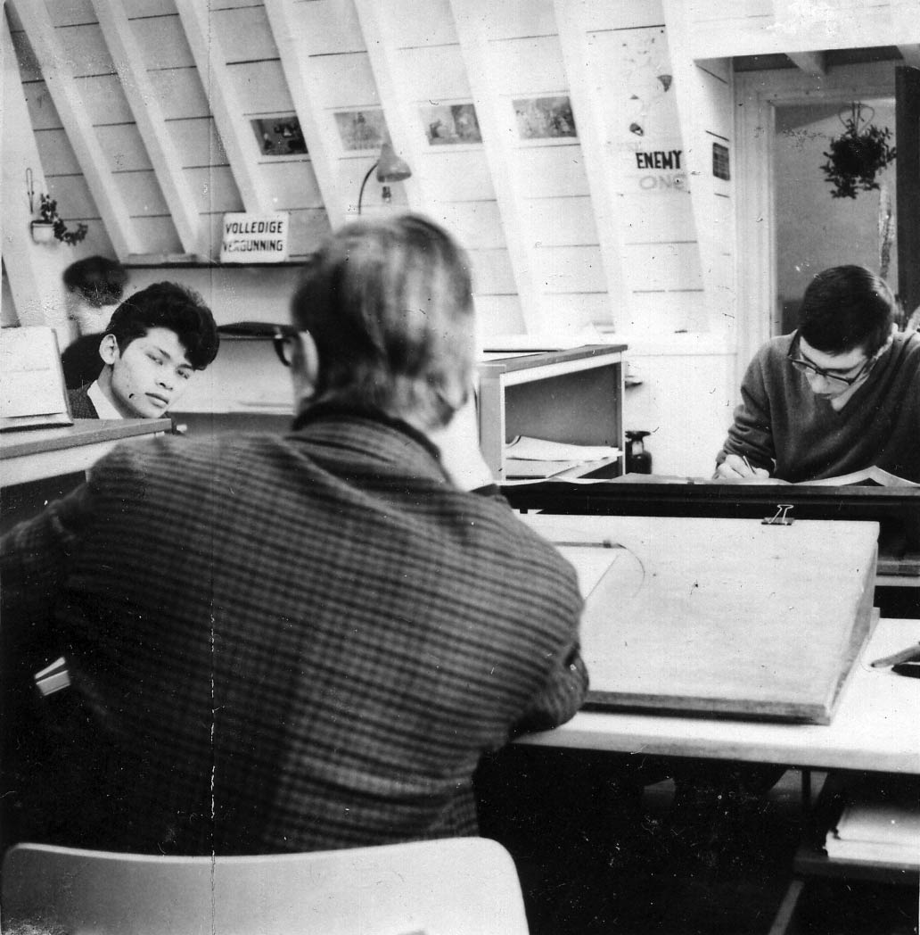 Op de derde etage werkten storyboardtekenaar en achtergrondontwerper Wim Giesbers en z'n leerling Dino Candotti, een veelbelovend tekenaar van mijn leeftijd.