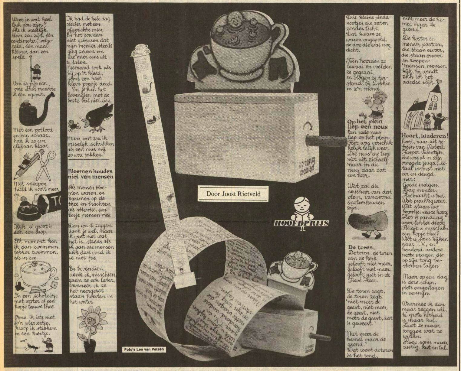 Rietveld continued to work in children's literature until at least the 1980s. He not only wrote and illustrated stories, but he also played with the form. In 1984, he won a children's literature contest held by newspaper NRC Handelsblad with a small box containing five illustrated stories in rhyme. It was subsequently collected in the compilation book called 'Stel Je Eens Voor...' by the publishing house Ploegsma. He was the author of the preschool picture book 'Het Boeven ABC', published in the shape of a house on the occasion of the "Children's Book Week" of 1986.