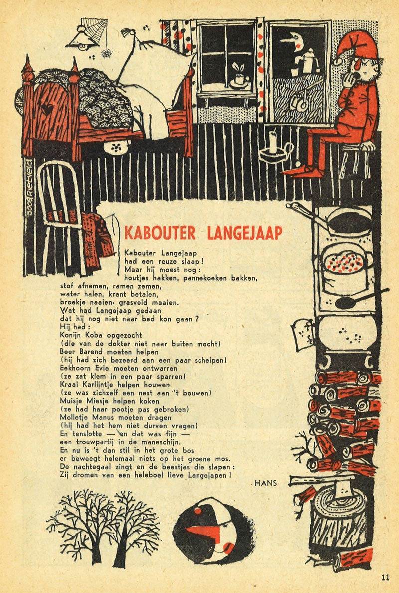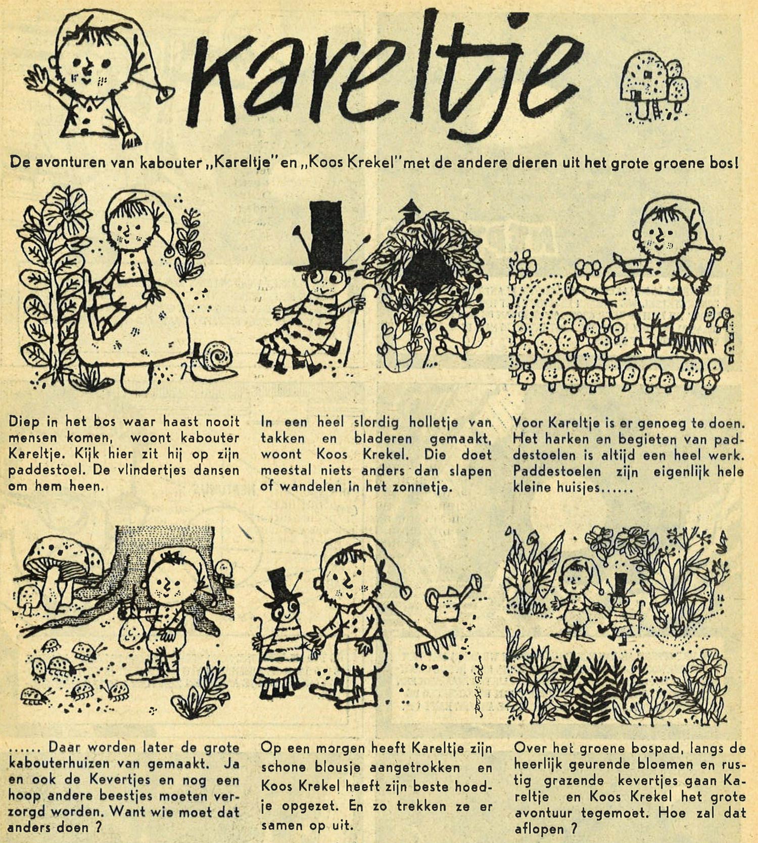 Olidin ran Rietveld's poetic text comic 'Kareltje' from issue #14 of 1961 until issue #4 of 1962. It stars a little gnome, who enjoys adventures with Koos Krekel and his other animal friends in the forest. In 1961, Rietveld moved to Amsterdam when Van Maanen transferred its operations to this city. However, he became a freelance artist eventually. In Okki's seasonal books he presented an updated version of his earlier character 'Kareltje'. Rietveld's daughter Mirjam released a self-published book collection of these 'Kareltje' stories in 2016.