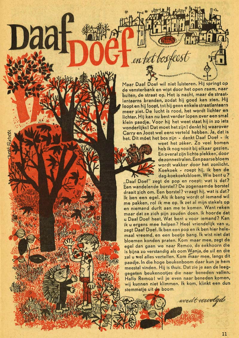 During the early 1960s, Rietveld was a prominent illustrator in Olidin, along with Joop Wiggers and a certain "hgd" (presumably Ton Hoogendoorn), while other important contributors to the magazine were Emile Brumsteede, Wim Giesbers, Frits Godhelp, Friso Henstra, Niek Hiemstra, Hans G. Kresse, Jan Kruis, Ted Mathijsen, Chris Roodbeen, Jan van der Voo, P. Visser, Dick Vlottes, Carol Voges and Piet Wijn. Rietveld's work was more poetic and aimed at the younger readers. His drawings illustrated fairy tales, text stories and short verses, which he also sometimes wrote. These included the serial 'Daaf Doef en het bosfeest' (issue #6 through #14 of 1962).