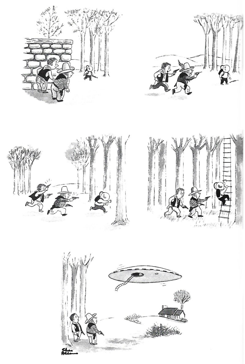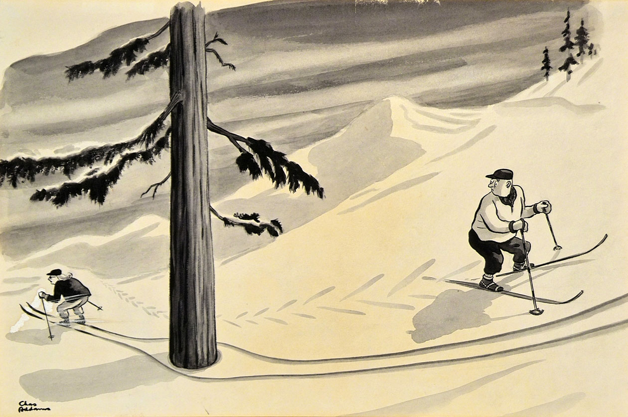 On 13 January 1940, Charles Addams submitted his classic cartoon 'Downhill Skier' to The New Yorker. The drawing shows a skier who managed to avoid crashing into a tree, by passing each leg around the trunk. It defies all logic and Addams gives us no explanation. All we see are the ski tracks, one to the left of the tree, the other to the right. 'Downhill Skier' became one of The New Yorker's most reprinted cartoons. Interviewed by Look magazine (15 December 1942), Addams was asked what were his two sweetest memories about his career. He answered: "1) Being bitten by a camel in Central Park. 2) The adoption of my ski cartoon by a Western asylum, to determine mental levels of patients." The skiing gag reached such an iconic status that numerous cartoonists have referenced, or even plagiarized it since. Dave Berg imitated the gag in an episode of his series 'The Lighter Side Of...', printed in Mad Magazine issue #205 (March 1979). He gave the absurd joke a more plausible explanation by letting two skiers, a man and a woman, each ski on one leg and drive around the tree, wondering afterwards "that some people are liable to get the wrong impression." In Mort Walker and Jerry Dumas's self-reflexive 'Sam's Strip', Sam tries to ski around the tree, but bumps against it, "because somebody switched the gag". Cartoonists Andy White and Jef Mallett used the same skiing gag in one of their own cartoons, though credited Addams for the original idea.