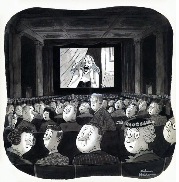 Charles Addams is most famous for his grim, horror-themed ink wash drawings. Since childhood he had a fascination for gruesome things. He built up a huge collection of creepy photographs and eerie woodcut engravings. They depicted deadly accidents, freak show artists or imaginative monsters. Part of his collection can be seen in his book 'Dear Dead Days: A Family Album' (G.P. Putnam & Sons, 1959). Many of Addams' cartoons have a disturbing, occult undertone. They are set in dark mansions with spooky libraries and eerie hallways. Characters often wander around in creepy castles, icky swamps and haunted graveyards. They are murdered, tortured or victims of cannibalism. Addams also loved to draw odd-looking people, some with physical deformities. Others Addams favorites are witches, ogres, extraterrestrial aliens and monsters. These characters and themes all gave him an instantly recognizable style, which stood out among the more conventional cartoons in most magazines. In the 1930s, Addams drew a cartoon of a boy scout whose father tries to hang himself, whereupon the boy corrects him that he's not using a "hangman's knot". When the cartoon was reprinted in a German magazine, many readers felt offended. Charles Addams' biographer, Linda H. Davis, said that Addams "would probably have been delighted" by the commotion caused by his drawing. Addams' cartoons have been compiled in the books 'Drawn and Quartered' (1942), 'Addams and Evil' (1948), 'Monster Rally' (1950), 'Home Bodies' (1954), 'Night Crawlers' (1957), 'Black Maria' (1960) and 'Favorite Haunts' (1976), all published by Simon & Schuster. The foreword of 'Drawn and Quartered' was written by Boris Karloff, the actor famous for his performance of Frankenstein's Monster.