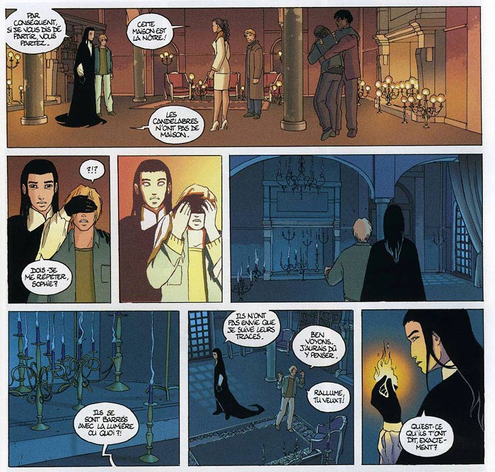 Algésiras spent several years developing her first comics project, 'Candélabres'. The plot revolves around a 14-year old boy, Paul Klarheit, who is physically handicapped. One day, he finds himself caught in a forest fire, where a mysterious creature saves him from certain death. The being introduces himself as Julien Solédango and says he's a "chandelier", a kind of guardian angel who can interfere whenever there's fire nearby. He also gives Paul the ability to move his legs again. Paul is intrigued by this strange entity and wants to find out more. The first volume of 'Candélabres' was published in 1999 by Delcourt, with three more titles following in 2000, 2002 and 2005.