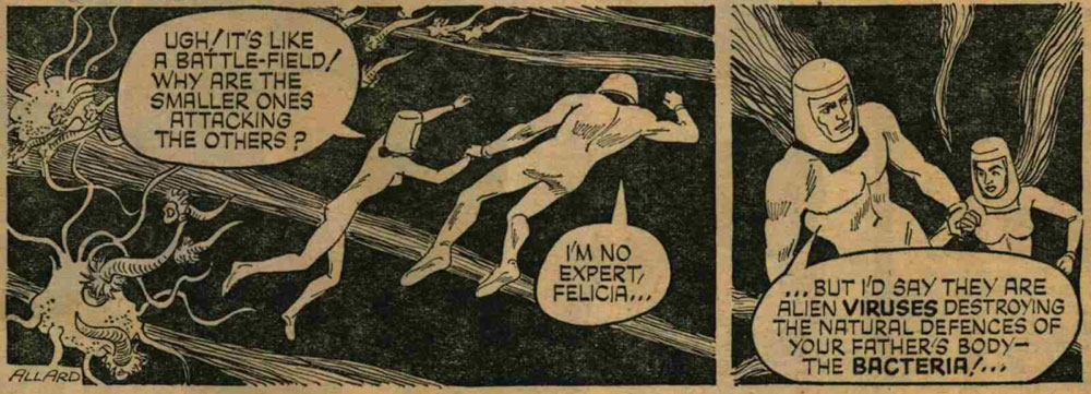 When in 1968, Steve Dowling retired from drawing 'Garth', John Allard succeeded him as artist, working with writer Jim Edgar. In 1971, Allard in turn was replaced by Frank Bellamy, although he continued to do background art during Bellamy's first couple of months. Between 1977 and 1983, Allard co-scripted 'Garth' with Jim Edgar. During its final years, the 'Garth' series was written by Angus Allan and Phil Harbottle and drawn by Martin Asbury.