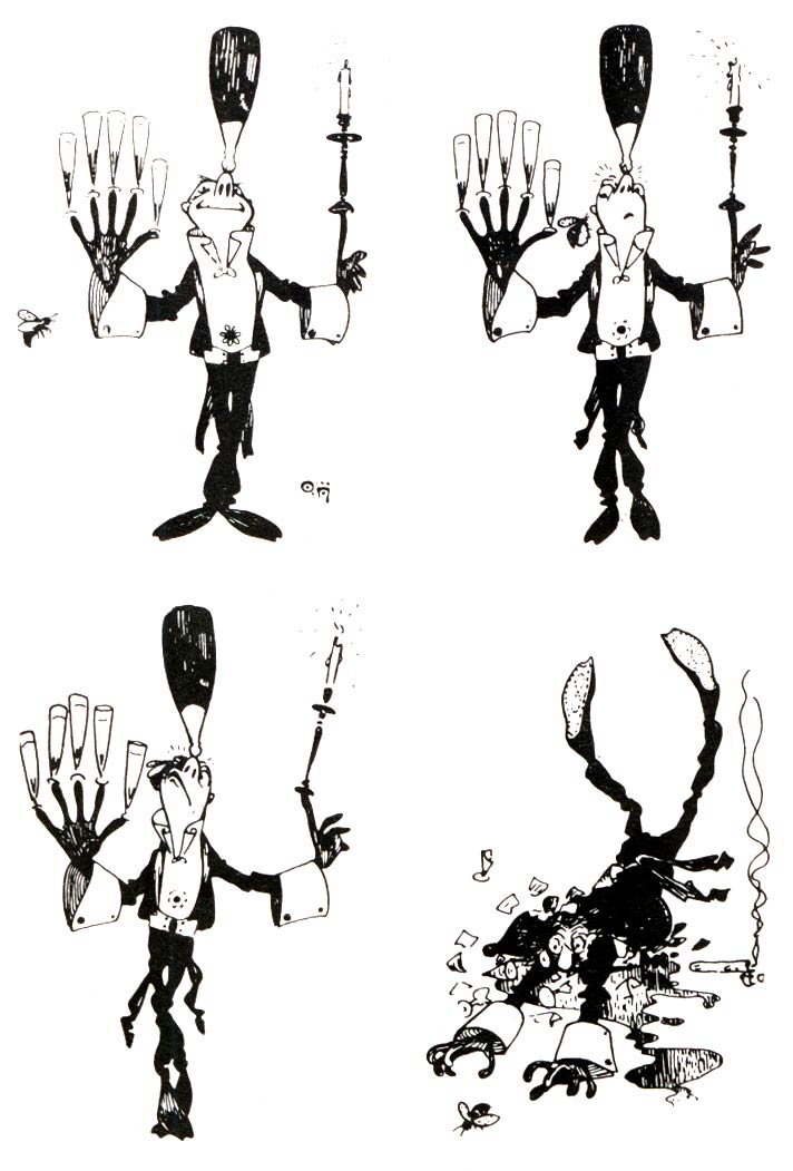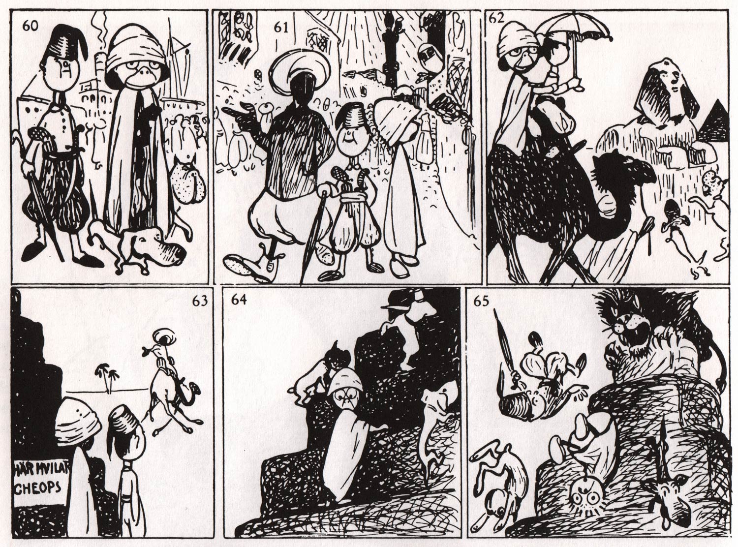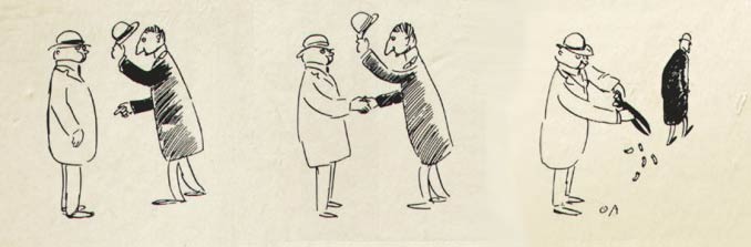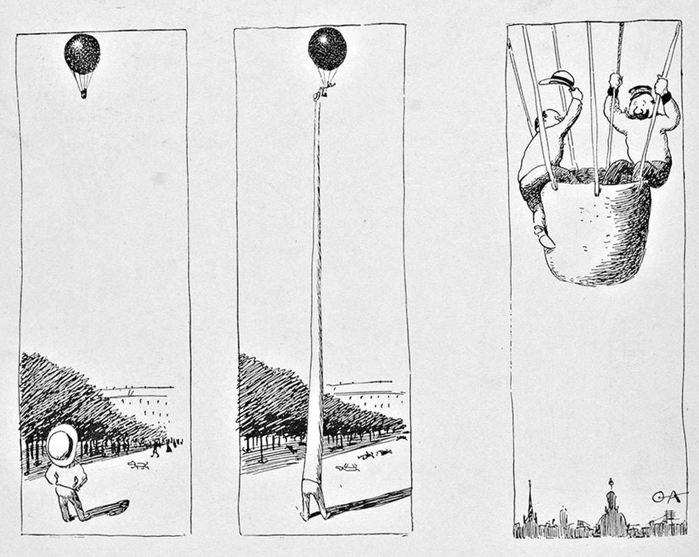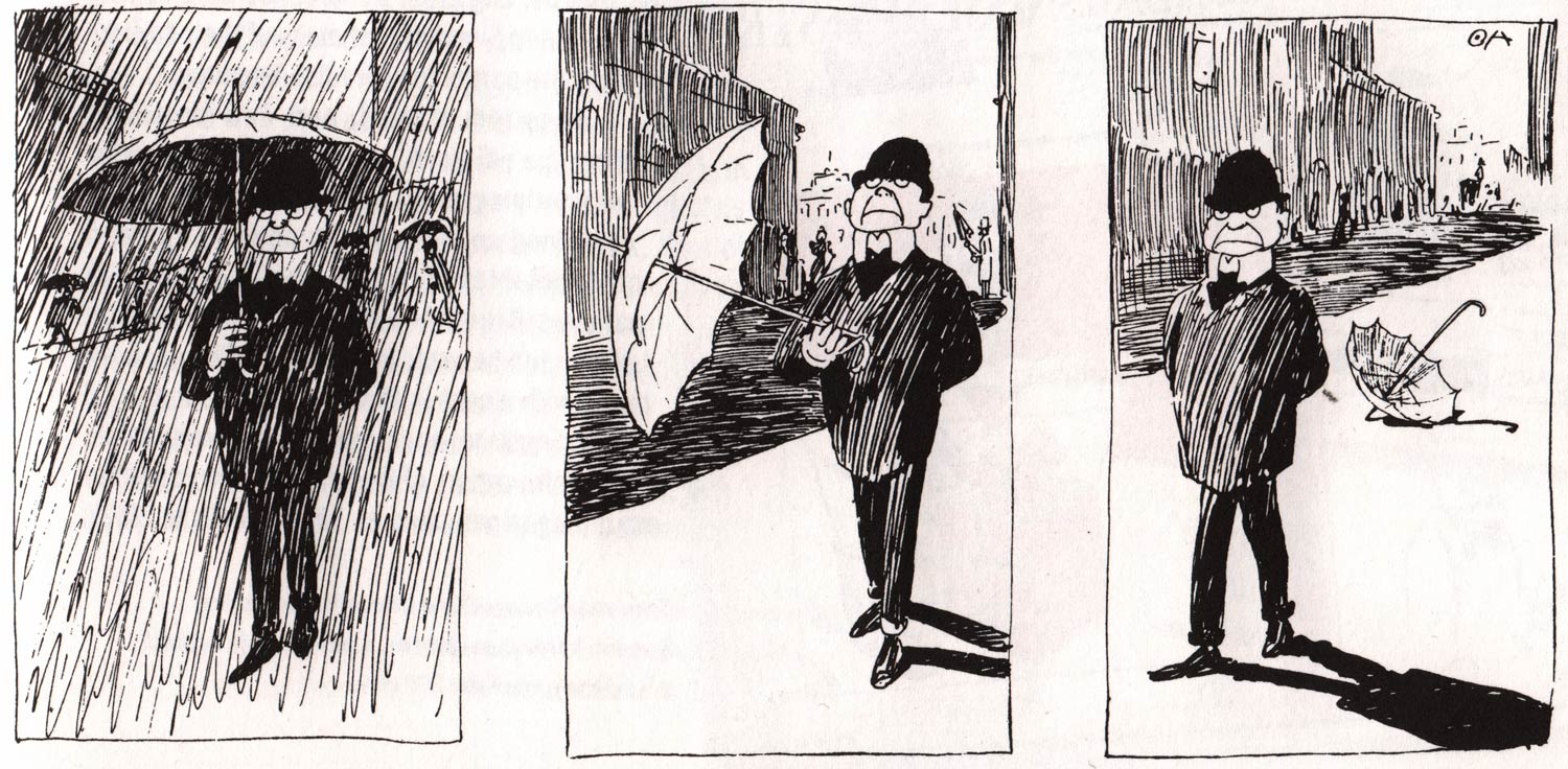 Söndags-Nisse editor Hasse Z was a mentor and close friend of Andersson, and the two men regularly went to pubs together. Andersson's lack of social skills often made him a laughing stock. The artist was incredibly shy and filled with frustrations. His drawings became his outlet, in which he could do whatever he wanted and fully express himself. This was especially evident in the pantomime comic 'Mannen Som Gör Vad Som Faller Honom In' ('The Man Who Does Whatever Comes To His Mind'), of which Andersson made about 20 episodes between 1902 and 1906. In this comic strip, all of the protagonist's actions are opposed to the principles of morals and mechanization. For instance, when he shakes hands with someone he dislikes, he cuts off his fingers afterwards. When it stops raining, he throws his open umbrella to the ground, and he enjoys watching a dynamite site at close proximity.