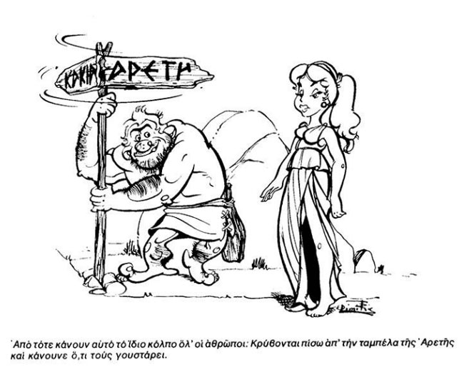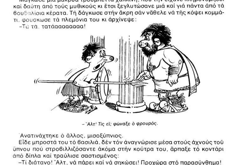 In Fantasy and Feeling, Antonopoulos illustrated George Marmaridis' 'The Ancient Losers' serial ('Ta Koróida oi Archaíoi', 1960). The humorous feature was a satirical take on Greek mythology, as told to an heir to the throne. With his surreal sense of humor, the author filled 74 weekly episodes, before leaving the magazine. Years later, Marmaridis approached Antonopoulos to provide the illustrations for a book publication as well, which compiled an extended edition of the original serial. Published in 1978, it is obvious that the illustrator copied many drawings from Albert Uderzo and René Goscinny's 'Asterix' comics.