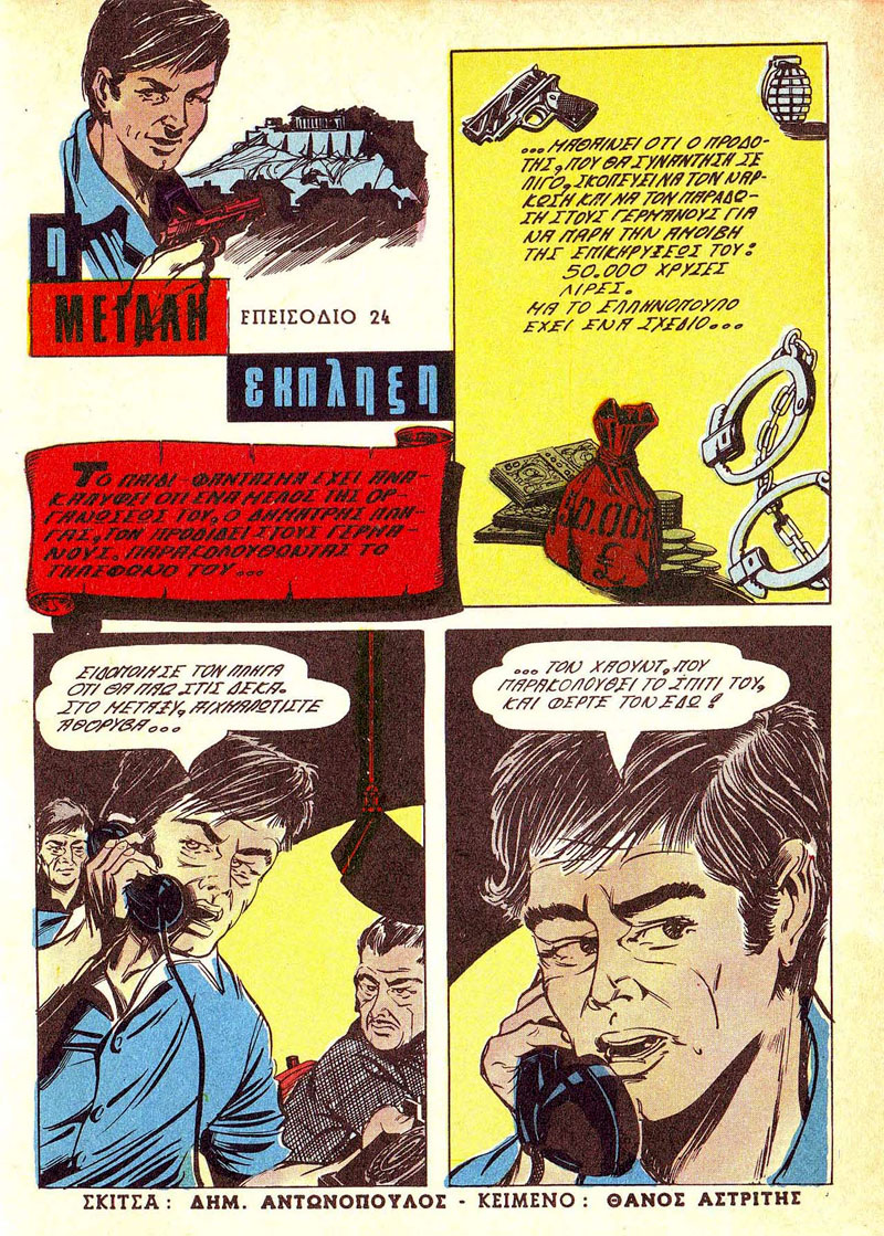 Between 1963 and 1974, Dimitris Antonopoulos additionally worked for the Greek pulp fiction title Maska magazine, and its later reboot, Jimmy Corini's Mask, in 1998. In the period 1969-1970, he also made illustrations for Eikonografimenos Mikros Iros ("The Illustrated Little Hero", issues #22-27), published by Stelios Anemodouras. It was a spin-off in comics format of the long-running title 'Mikros Iros', about the struggles of three heroic children with German, Italian and Bulgarian fascists during World War II. Byron Aptosoglou was the title's main illustrator. Dimitris Antonopoulos passed away in 2004.