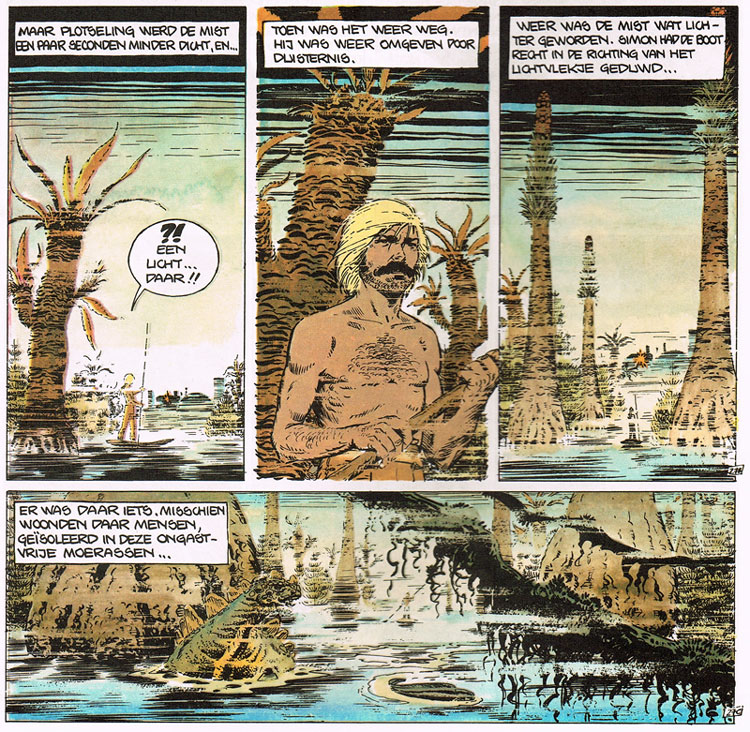 While still working for Pilote, Auclair had his first publications in Tintin, such as the western 'La Saga du Grizzly' and 'Les Naufragés d'Arroyoka' with Greg. For Tintin, he also made his most famous series, 'Simon du Fleuve', in 1973, for which he did both text and artwork. This post-apocalyptic saga ran until 1978 and had a brief reappearance in 1988 and 1989, when Auclair started a second cycle with writer Alain Riondet.