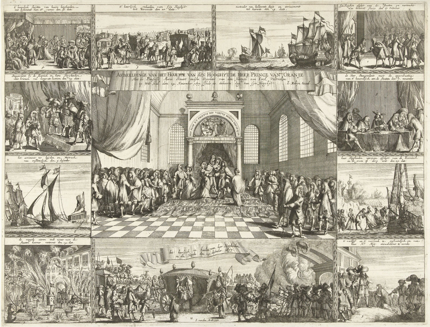 In 1677, Van den Aveele made a graphic report about the marriage between Dutch "stadhouder" Willem III of Orange and English princess Maria Stuart: 'Afbeeldinge van het Houlyck van syn Hooghyt de heer Prince van Oranje met de Prinsesse Maria Stuart, Oudste Doghter van den Hertogh van Iorck'. The wedding ceremony is shown in the center of the image. Around this large drawing we find several smaller drawings that ought to be read horizontally, from right to left. The only exception is the final row, where the 11th and final image is placed between the 10th and the 9th. To help the reader, Van den Aveele numbered each panel and printed a description underneath. First it is shown how William says goodbye to his government in the Dutch coastal town Hellevoetsluis before his trip to England. After arriving on English soil, the groom is welcomed and congratulated by English nobility. When the newlyweds return to the Netherlands, they ride around in the royal coach in The Hague, while fireworks (as seen in the 10th panel) celebrate the event.