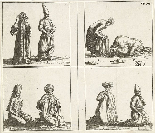 Another interesting prototypical comic strip by Van den Aveele can be found in Guillaume Grelot's travel report about Constantinople (present-day Istanbul): 'Relation Nouvelle d'un Voyage de Constantinople' (1681). In a four-panel illustration, the artist depicts how Muslims pray. Presented are two differently clothed men in each image. They stand up, kneel, roll out their prayer rug and worship Allah. While they are certainly not intended as the same duo, their actions are depicted chronologically.