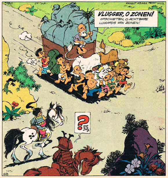 Azara was also expanding his activities by appearing in other magazines besides Tintin. He drew 'Bonnedague' in Record (1962-66), 'Pauvre Icare' in Chouchou (1965), as well as 'Mayflower' (1963-65), 'La Campagne de Grèce' (1965) and 'Monsieur Chapomou' (1965-66) in Pilote in cooperation with scriptwriters like Jacques Acar, Jacques Lob, Maurice Rosy and Crespin. Together with Vicq, he created yet another Japanese hero, the samurai 'Haddada Surmamoto', for Tintin's competing magazine Spirou in 1967-68. He returned to Spirou once again in the early 1980s with 'Zagazik'.