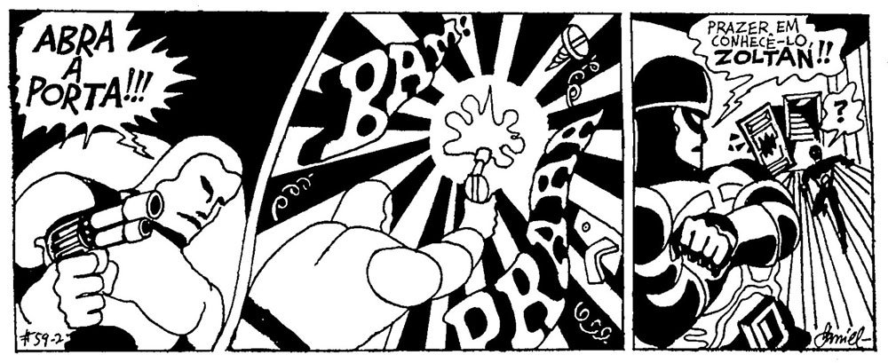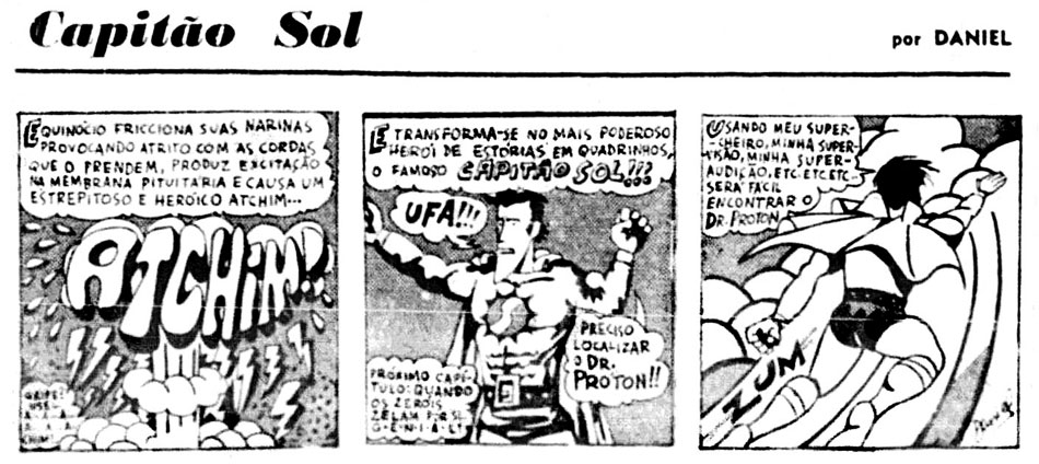 Between 1967 and 1968, Azulay published in O Sol, a short-lived tabloid supplement of Jornal do Sports, a paper circulating in Rio de Janeiro. Among his colleagues were artists like Juarez Machado, Vagn, Henfil and Ziraldo. Azulay created the serialized comic strip 'Capitão Sol', a satire of U.S. superhero comics. The main character is Equinox, a young and naïve journalist who transforms into the superhero Captain Sol whenever he says the word: "Atchim!". Sol's main nemesis is Dr. Proton who wants to obtain a large amount of LSD so he can launch his diabolical FX-plan on mankind. Certain scenes nearly got Azulay in trouble with the censors, because they poked fun at the real-life dictatorial regime in his country.