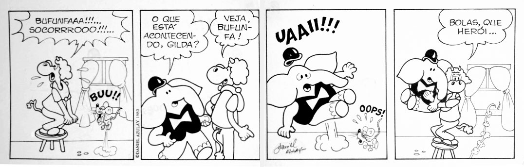 Daniel Azulay was a Brazilian media figure, active in many disciplines, from paintings, children's books, TV shows, video games to comics. Early in his career, he made the superhero parody comics 'Capitão Sol' (1967) and 'Capitão Cipó' (1968-1969), but he is best remembered for the 'Turma do Lambe-Lambe' (1975) franchise, which inspired both a children's TV show and its own 1983-1984 comic magazine. Always dressed in colorful ties, shirts and suspenders, Azulay gave children a positive outlook on life with respect for the environment.