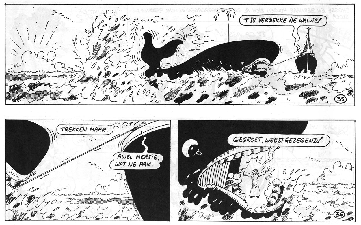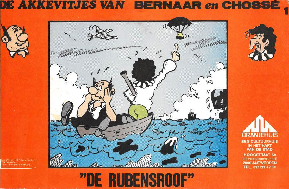 During this same period, Backer Overbeek was also co-creator of the comic series 'De Akkevitjes van Bernaar en Chossé'. Two known albums were released, 'De Rubensroof' (Oranjehuis, 1977) and 'De Ellebooggast' (Media Uitgaven, 1981). The opening panel of the first story refers to an earlier story, 'De Keet van Chossé', but no book publication is known. One of the protagonists is a bald, big-nosed man from Antwerp, Bernaar. His friend Chossé is a tall and slender Spaniard, and has a hook nose with a mustache. The stories have a regional Antwerp atmosphere, with political-satirical undertones.