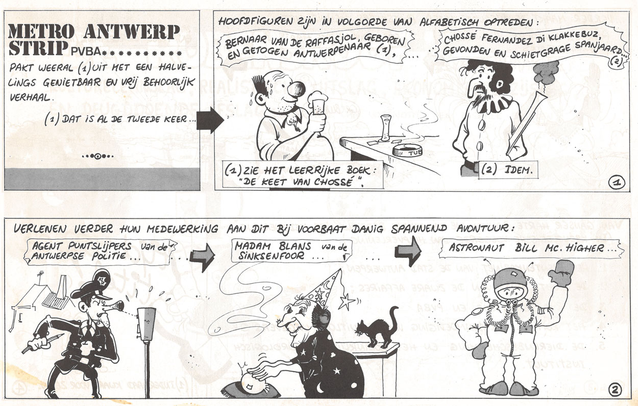 'De Rubensroof' was released during the celebration year of the 400th birthday of painter Peter Paul Rubens, whose house is one of Antwerp's major tourist attractions. Much like the 'Suske en Wiske' adventure 'De Raap van Rubens' (1977), drawn by Paul Geerts, it benefited from the public attention for the famous painter that year. It is therefore not unlikely that at least 'De Rubensroof' was serialized in a newspaper, presumably Gazet van Antwerpen, since it circulates in the province of Antwerp and the writer of the comic was Piet Schepens (31 March 1943 - 28 February 2014), a journalist for this paper. Another strong indication is the style of comedy. 'Bernaar en Chossé' is very reminiscent of Pom's comic strip 'Piet Pienter en Bert Bibber', the star series of Gazet van Antwerpen. Both feature meta-commentary on the plot development within the narrative. Schepens was also active as Kapellmeister (master of the chapel choir) of the Carolus Borromeus Church in Antwerp and later also provided the script for another short-lived regional comic series serialized in Gazet van Antwerpen, namely 'Met De Neus en Co. op Stap', drawn by Hugo Leyers.