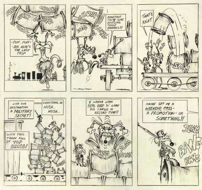 After hours, Bakshi created comic strips as an outlet to his personal problems. Some of these secret drawings were purely meant to vent frustrations and so he kept them hidden. 'Dum Dum and Dee Dee' reflected troubles between him and his wife. 'Bonefoot and Fudge' featured the mishaps of a wolf and a mouse, while 'Junktown' had anthropomorphic rocks, garbage cans, mailboxes and other street junk interacting with one another. Both centered around people who spent too much time squibbling over trivial matters, a frustration he often felt when dealing with studio heads and executives. He tried to get 'Junktown' published in The Post, but the publisher didn't understand it. In 1988, he also tried to produce it into an animated TV series, but only got as far as a pilot, 'Christmas in Tattertown', which became the first original animated special airing on the channel Nickelodeon. According to Toonopedia, Bakshi may have drawn a comic strip adaptation of Gene Deitch's animated character 'Tom Terrific' too.