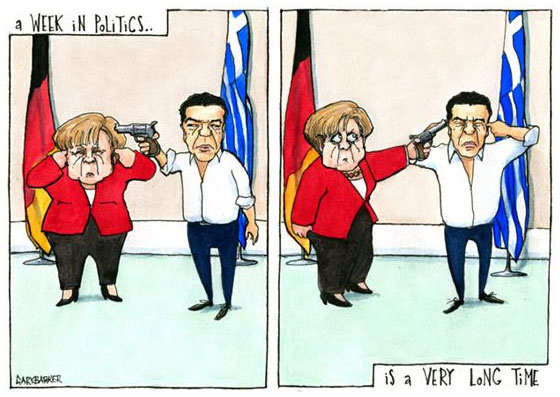 Cartoon from The Times (13 July 2015) depicting German chancellor Angela Merkel and Greek Prime Minister Alexei Tsipras discussing financial aid of the European Union to Greece, who suffered a debt crisis in the 2010s. A majority of the Greek population rejected austerity measures by the E.U. by public referendum, which seemed to give Tsipras an advantage over the E.U. However, Merkel has Greece in a stronghold too, since the country doesn't have much options left. The line "A week in politics is a very long time" was famously uttered by British Prime Minister Harold Wilson.