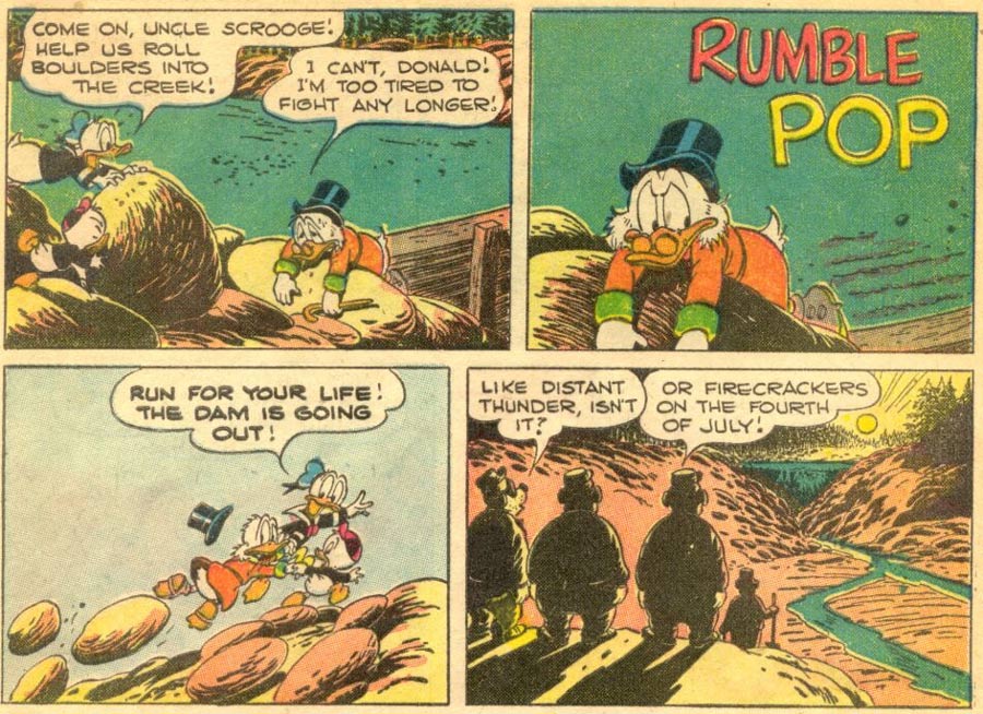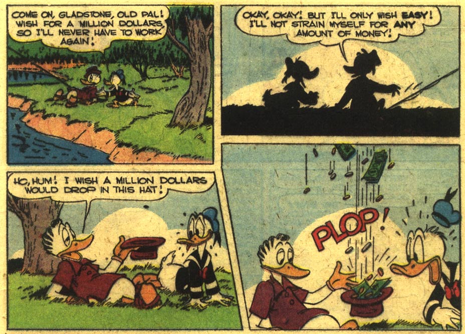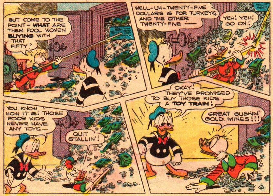 Some of Donald's adventures are clever satirical metaphors. In 'Tralla La' (1954), Barks lampoons both capitalism and colonialism. Scrooge travels to a country without a monetary system where the people live in peace. Yet when he throws his bottle caps around, the inhabitants start treating them as valuable items. The greedy duck realizes the financial possibilities and brings over as many bottle caps as he can, until the paradise is ruined forever. 'A Financial Fable' (1950), on the other hand, defended capitalism over the dangers of easy money. When Scrooge's entire fortune is blown away by a cyclone and scattered all over, everyone in Duckburg is suddenly a millionaire. As they all quit working, Scrooge quietly runs a farm with Huey, Dewey and Louie as his helping hands. In the end, Scrooge has the monopoly on every possible accessory that the Duckburgians need and quickly regains his wealth.