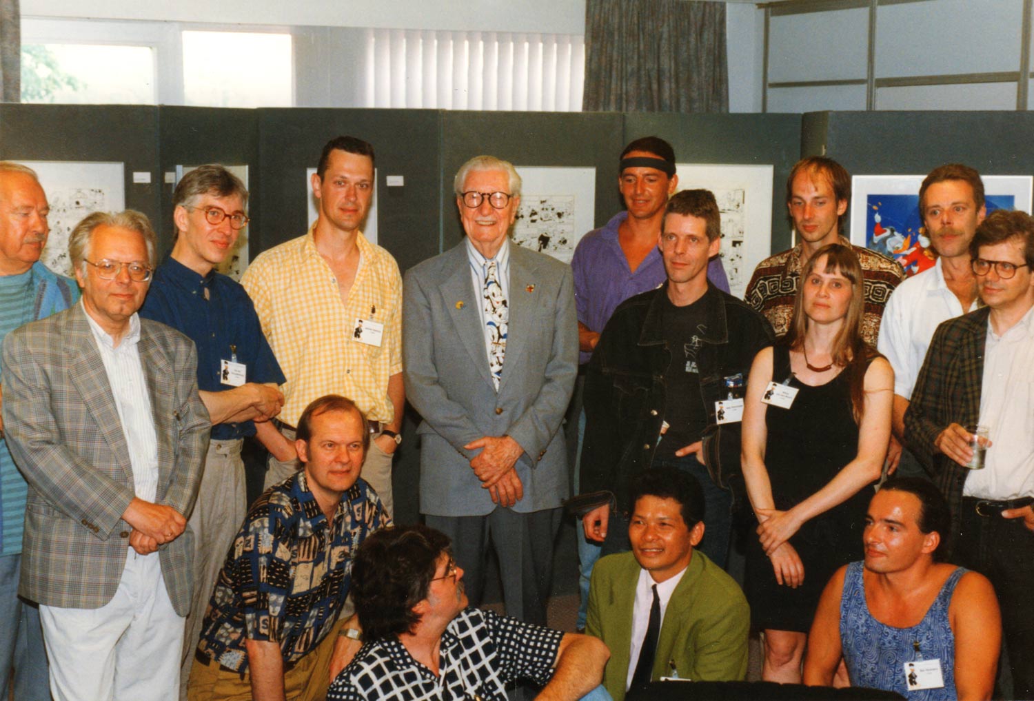 Carl Barks with the writers and artists of the Dutch Donald Duck during his visit to the Netherlands in 1994. From left to right, top: Piet Wijn, Harry Balm, Ed van Schuijlenburg, Michel Nadorp, Carl Barks, Mau Heymans, Jaap Stavenuiter, Frank Jonker, Wilma van den Bosch, Ben Verhagen, Hilbert Bolland. Bottom: Jan Kruse, Daan Jippes, Lucas Abedy, Bas Heymans.