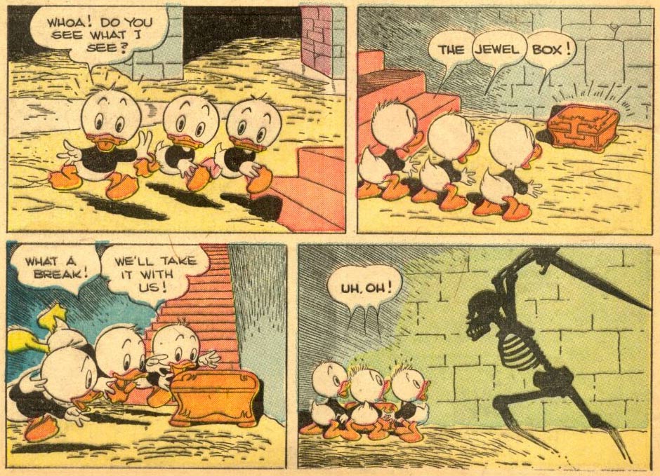During his days as an animator, Barks already worked with side characters of Donald he later used in his comics. In 1937, comic writer Ted Osborne and artist Al Taliaferro had introduced Donald's nephews Huey, Dewey and Louie in their 'Donald Duck' newspaper gag comic. The trio made their screen debut in the 'Donald Duck' cartoon 'Donald's Nephews' (1938), directed by Jack King. Their names were hought up by Disney writer Dana Coty and borrowed from U.S politicians Huey Long and Thomas E. Dewey and Disney animator Louis Schmitt. With their introduction, Taliaferro and Ted Osborne also established a now classic origin story for Huey, Dewey and Louie. They were sent to Donald by their mother Della "to stay with him for a while." Their father is apparently "in the hospital" after "a firecracker exploded under his chair." It soon becomes clear that she merely wanted to get rid of the mischievous little brats. To Donald, his nephews are quite a handful, but he takes equal delight in playing mean tricks on them too. Since the triplets never returned to their biological parents, Donald effectively became their adoptive father.