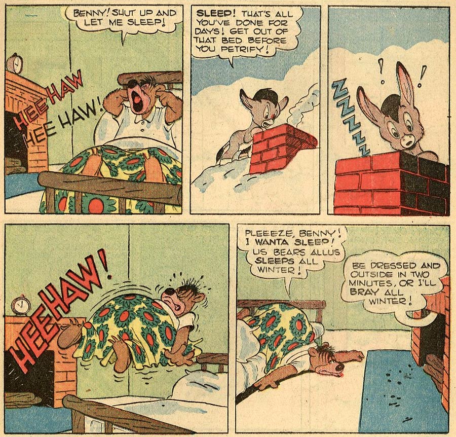 While most famous for Duck stories, Barks also made a few comics with other characters for Dell Comics/Western Publishing. He drew one 'Mickey Mouse' story ('The Riddle of the Red Hat', 1945), and also worked on some of the non-Disney titles. Between 1944 and 1947, Barks wrote and illustrated 26 stories of MGM's 'Barney Bear and Benny Burro' for the Our Gang comic book. These stories were collected in 'The Carl Barks' Big Book of Barney Bear' (IDW, 2011). Barks drew Walter Lantz's 'Andy Panda' for New Funnies in 1943 and made one story with Tex Avery and Friz Freleng's 'Bugs Bunny and Porky Pig' ('Porky of the Mounties' in 1944) as well as Avery's 'Droopy'. Yet, despite these stylistic breaks, none of these characters quite suited him, and he preferred to focus exclusively on his own duck universe.