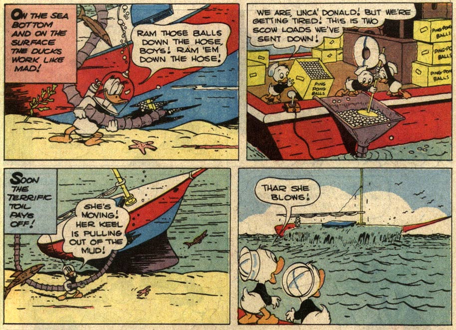 Thanks to the global reach of the Disney empire, Barks' comics are read by millions of people across the world. As such, they managed to have a remarkable impact on our present-day society. In 1964, Danish inventor Karl Kroyer came up with the idea to recover a sunken boat from the bottom of the sea by stuffing a large amount of ping-pong balls in the wreck. As he was in The Netherlands at the time, Kroyer went to a Dutch patent office, but to his surprise his patent application was rejected. As the Dutch are fanatically attentive 'Donald Duck' readers, they were quick to point out that Barks had already used a similar technique in 'The Sunken Yacht' (1949), fifteen years earlier. In this story, Donald and the nephews recover a sunken yacht by filling it up with ping pong balls.