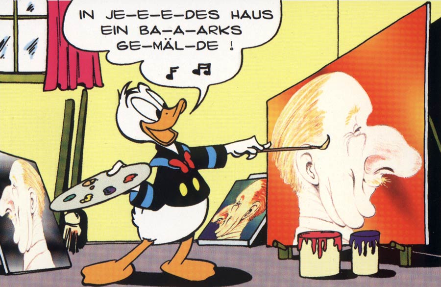 Donald Duck paints Carl Barks. Donald and most of the scenery are original Barks art. Barks' face, however, is drawn by German artist Klaus Bohn. This collage drawing was designed as the cover of a 1996 German calendar featuring reproductions of Barks' oil paintings. Translation of the speech balloon: "In every house a Ba-a-arks painting" - © Disney..