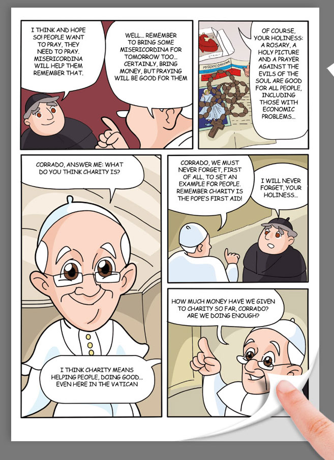 Aldo Barrese was the main artist behind the Pope Francis comic magazine. Revealing his background in Disney comics, Barrese draws the pope with big eyes. The magazine adapts the papal messages in comic strip format, specifically rewritten to be understandable to children. Apart from gag comics and a biographical comic for older children, it also features coloring games. On 10 February 2014, Edizioni Master also brought a Pope Francis-themed app on the market, also in co-production with the RAI. The artist has taken great pride in the fact that the real-life Pope Francis was photographed reading his comic.