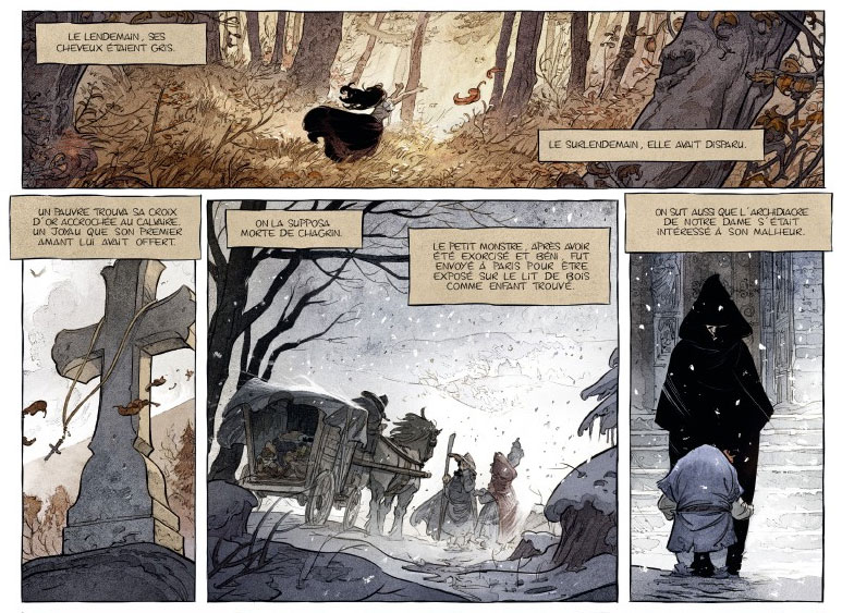 Bastide's talent was noted by Yslaire, who hired the young man to work on one of his series about the Sambre dynasty. Together with his high school friend Vincent Mézil, Jean Bastide was tasked to draw the 'Hugo & Iris' trilogy in the series 'La Guerre des Sambre', a historical romance story set in 1830. The duo illustrated and colored the three books, published between 2007 and 2009 by Futuropolis/Glénat. Bastide subsequently teamed up with scriptwriter Robin Recht to create 'Notre Dame' (2012-2014) at Glénat Caractère, a lightweight and free adaptation of Victor Hugo's 'The Hunchback of Notre-Dame'. The series was intended to consist of three albums, but only two were published.