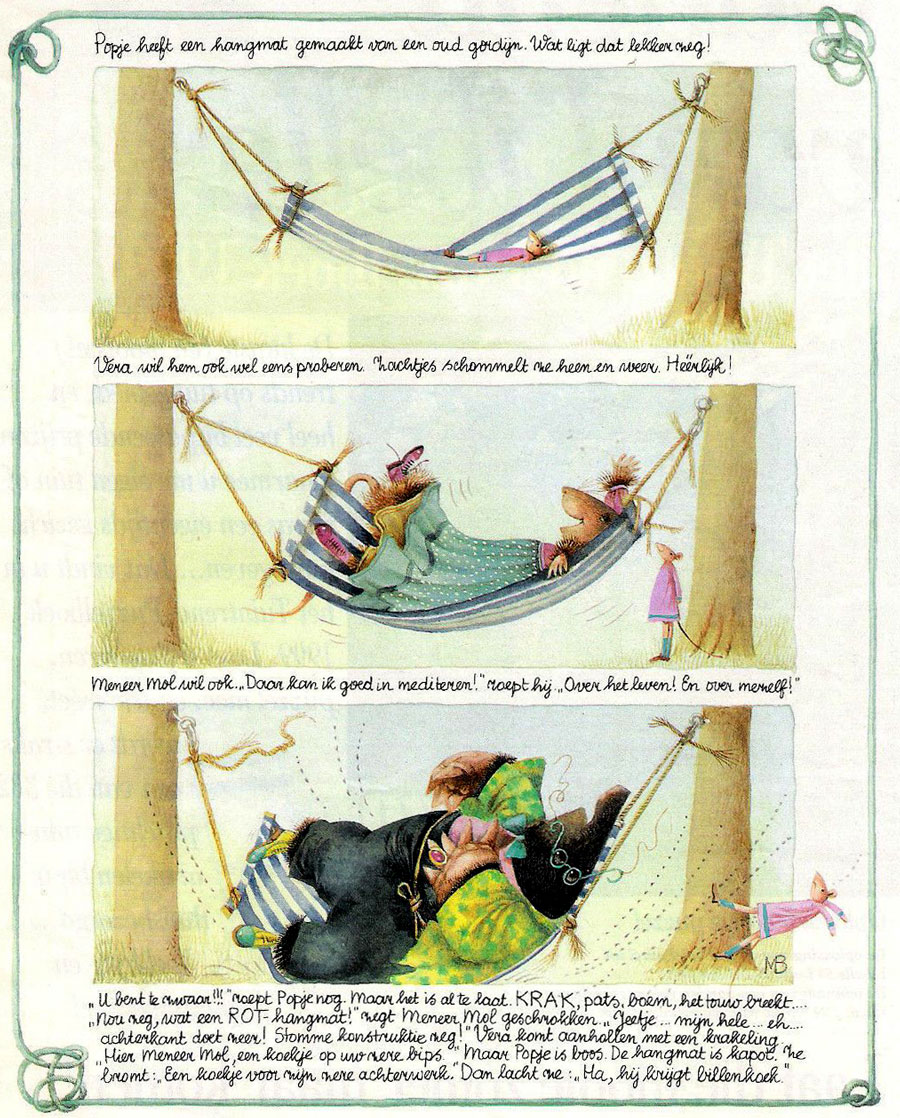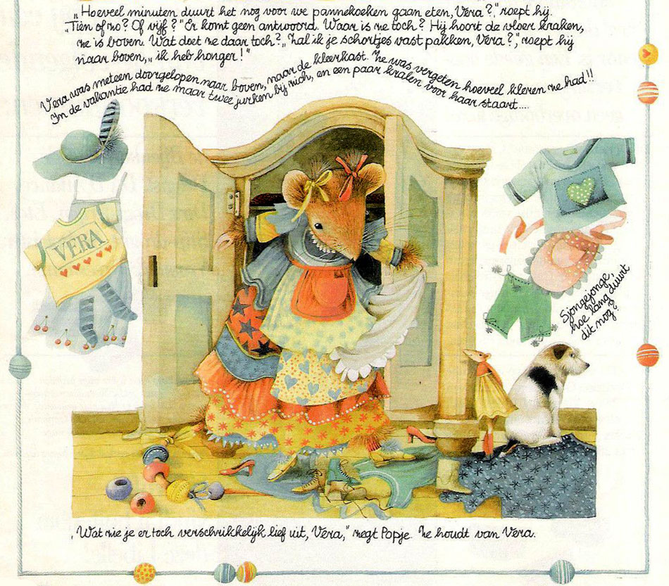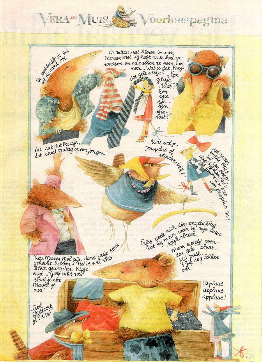 Most of Bastin's drawings are true to nature, but she also tried her hand at fantasy. Inspired by the British illustrator Beatrix Potter, she created 'Vera de Muis' as another weekly section in Libelle during the 1980s and 1990s. The adventures of the little field mouse also appeared in several booklets published by Terra in Zutphen (1985-1988). Vera lives in a cozy house in the forest, where she has both funny and exciting adventures with her friends, including the wren Kipje, Mrs. Bumblebee ("Mevrouw Hommel") and Fritsje the mouse. Bastin's dog Saar also got a role in the stories. The animal characters are dressed in long skirts, cute aprons and sweet bows, adding a sense of nostalgia to the series. While the tales are best described as picture stories, several illustrations follow a sequential narrative, like in comic stories.