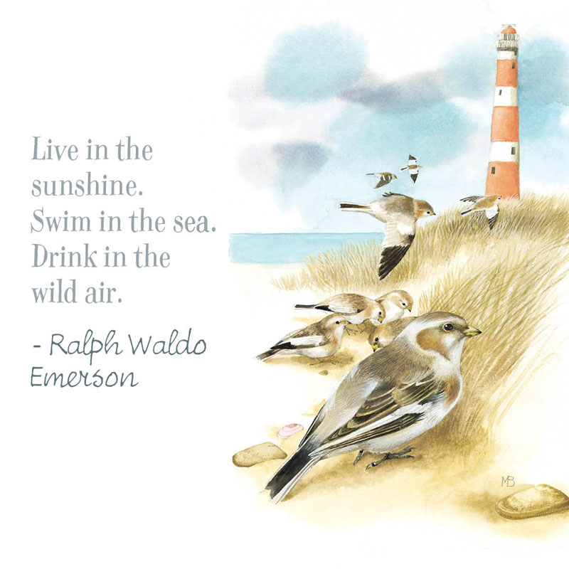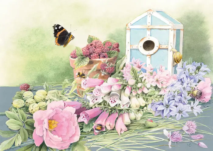 Marjolein Bastin's activities quickly multiplied. In 1979, she also got a regular spot in the newly launched nature magazine Grasduinen, for which she illustrated a monthly wildlife spread. She filled several nature-related books with her drawings, either created on her own or in collaboration with Grasduinen editor-in-chief Frans Buissink or bird watcher Nico de Haan. She additionally illustrated her father's children's book 'Het Voorleesboek van Hops' (1977). Bastin found a worldwide audience through the many diaries, notebooks, calendars, eiderdown covers, dinnerware and greeting cards filled with her depictions of butterflies, birds, flowers and Dutch polder landscapes. The Italian nature magazine Airone also ran her illustrations and, since the 1990s, Marjolein Bastin's artwork has appeared on a great many Hallmark cards in the USA.