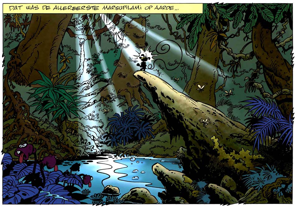 Batem's work was noticed by André Franquin, who at the time was searching for new possibilities with his Marsupilami character. The leopard-spotted monkey-like animal with its extremely long tail, short-tempered nature and familiar "Houba! Houba!" call was created by Franquin in the 1951 'Spirou et Fantasio' episode 'Spirou et les Héritiers'. He remained a regular cast member until Franquin left Spirou magazine's title comic and handed it to Jean-Claude Fournier. As one of his most treasured creations, Franquin kept the rights to the Marsupilami to himself. However, from the late 1960s through the mid-1980s, the animal only appeared in sporadic gags, as well as a handful of short stories situated in the animal's natural habitat, the Palombian jungle.