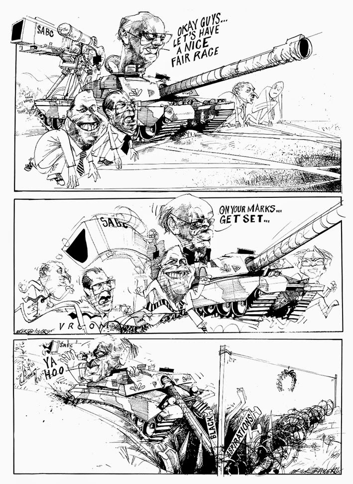 In October 1985, Bauer approached the newly founded newspaper The Weekly Mail in Johannesburg with his portfolio of drawings. He remained affiliated with the newspaper until 1990, drawing cartoons about national and international politics, as well as sports, in his personal column, 'Derek Bauer's World'. As a white man, Bauer was privileged under the apartheid regime, yet used his sharp pencil and pen to create dozens of cartoons that were fiercely critical of South Africa's government censorship, the racial injustice and brutalities of the regime. In the late 1980s, the South African government censored all criticism of its policies. Alternative newspapers were an important voice of rebellion, with Bauer rising as the most significant political cartoonist. While his colleagues often self-censored their drawings out of precaution, Bauer continued to put his thoughts on paper, without caring whether it would cause him trouble. His confrontational drawings challenged the reader, leaving them with a disturbed, uneasy feeling.
