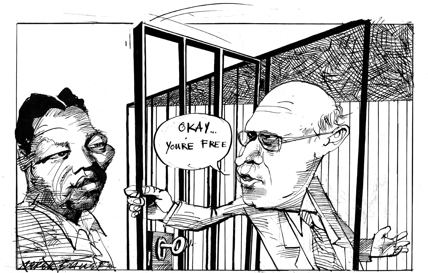 Cartoon depicting Nelson Mandela's liberation, 25 January 1990. South African Prime Minister F.W. De Klerk opens his door, but through an optical illusion it appears as if De Klerk is simultaneously entering in a cage of his own.