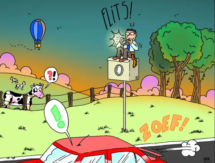 In early 2020, Bavo first teamed up with Brakel mayor Stefaan Devleeschouwer to make some of the town's municipal measures and communication public. Devleeschouwer's approach was unusual in the sense that he let a local cartoonist visualize his message through humorous comics and cartoons, which then went in circulation on news sites and social media channels. On 20 February 2020, the Bavo cartoon about speed limits was made public. At the time, several speed cameras near the highway were out of order and had to be replaced. Since many drivers assumed that they could easily exceed the speed limits, Devleeschouwer and Bavo's cartoon informed them their impression was not true. Although the cameras didn't work, the local police still kept an eye on the road. In Bavo's cartoon, mayor Devleeschouwer is literally sitting on the camera pole taking flash photos of road hogs and speed demons.