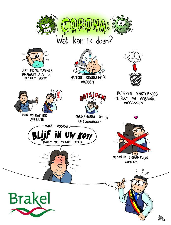 In March 2020, the COVID-19 virus became a global pandemic. In many countries lockdowns were implemented on the population, to get the spreading of the coronavirus under control. Having proven the effectiveness of reaching the Brakel townspeople through cartoons, Bavo was asked to summarize and visualize methods of how to avoid COVID-19 in comic strip format. On 14 March 2020, the comic 'Corona: Wat Kan Ik Doen?' ("Corona: What Can I Do?") was distributed. It stars mayor Devleeschouwer and Belgian Minister of Health Maggie De Block as protagonists. The cartoon also references De Block's infamous blunt command "Blijf in uw kot!" ("Stay in your shack!") when she informed the Flemish citizens to stay home as much as possible during the lockdown.