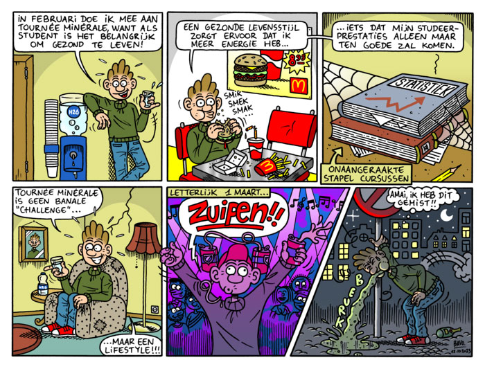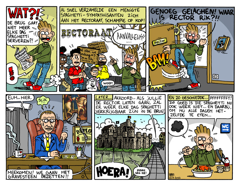 Bavo Bobelijn was born in 2003 in Kortrijk, West Flanders. His parents both worked as nurses. He grew up with classic Flemish comics and ranks Willy Vandersteen's 'Suske en Wiske', Willy Linthout's 'Urbanus' and Marc Sleen's 'Nero' among his main graphic influences. Later, he also expressed admiration for Martin Lodewijk's 'Agent 327'. As a comic artist, Bobelijn is completely self-taught. While still a teenager, his cartoons gained local attention when they appeared on local news sites like 't Brakelt, a blog focusing on local news from the East-Flemish town Brakel. In 2021, he enrolled at the University of Ghent to study Communication Science.