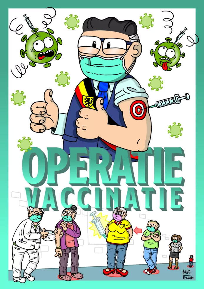 When the vaccination campaigns finally got started, the COVID-19 info call center in Brakel was overwhelmed with questions. To help the medical teams, mayor Devleeschouwer ordered another educational cartoon. Released on 2 April 2021, 'Operatie Vaccinatie' ("Operation Vaccination"), summarized the frequently asked questions, so that people wouldn't have to bother the call center with them.