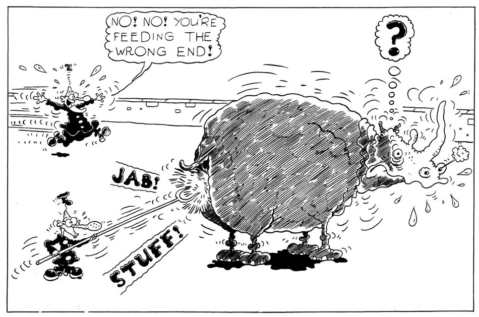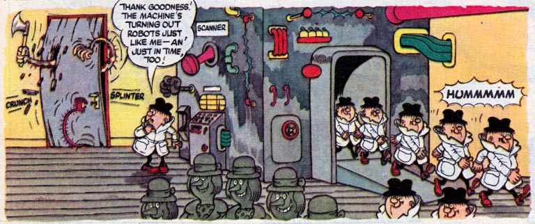 However, Baxendale spent so much time on each comic that he frequently missed his deadlines. For him, this had a plus side. By the time his pages finally arrived at the office, his editors usually had no time or interest to check every detail of his immensely busy panels. Since the drawings were already overdue, they just went ahead and printed them. As a result, Baxendale could avoid censorship and became the only comic artist at The Beano and The Beezer with more creative freedom than the others. Still, the overall workload remained exhausting. As sales increased, so did the demand for his work. He didn't just whip out several weekly features for two separate magazines, he had to create material for their annual specials as well and occasionally ghostwrite - and draw - for some of his colleagues. Baxendale hardly found the time and energy to maintain his personal quality levels.