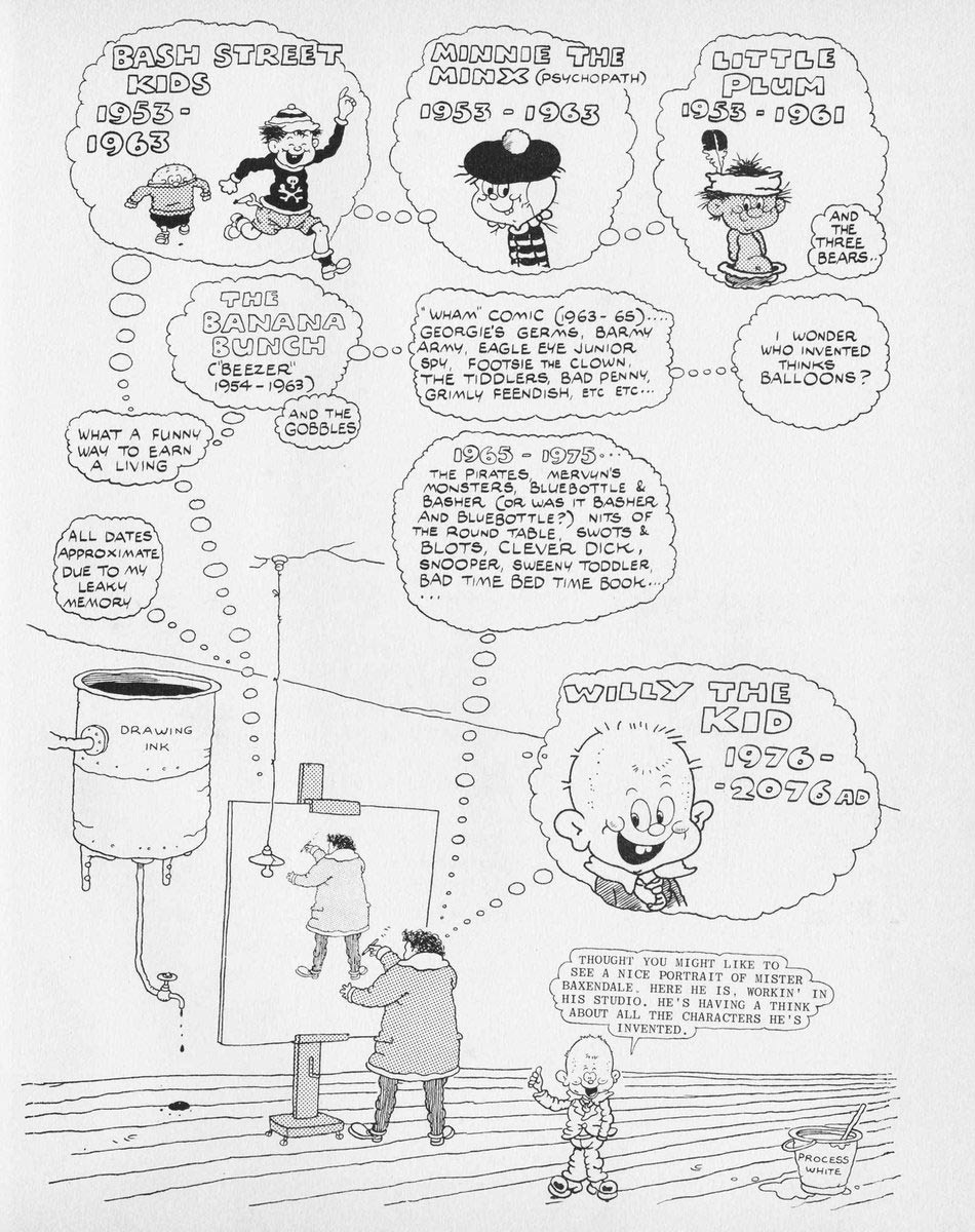 One of Baxendale's final comics was 'I Love You Baby Basil' (1990-1991), which ran in The Guardian. An eyestrain eventually forced him into retirement, but he remained active as a writer and spokesperson for British comics. In 1978, Baxendale had published his semi-autobiography named 'A Very Funny Business: 40 Years of Comics' (1978). To pay tribute to his main idol, Baxendale wrote a letter to Carl Giles to acknowledge his heavy debt to him and offer him a copy of this book. His court case against DC Thomson became the subject of another book, 'The Encroachment Part One', which Baxendale self-published in 1988 under the imprint Reaper Books. It was followed one year later by 'On Comedy: The Beano and Ideology', and then later by other books that gave great insights into his career, as well as his personal thoughts about cartooning, such as 'Pictures in the Mind' (1998), 'The Beano Room' (2005) and 'Hobgoblin Wars' (2009).